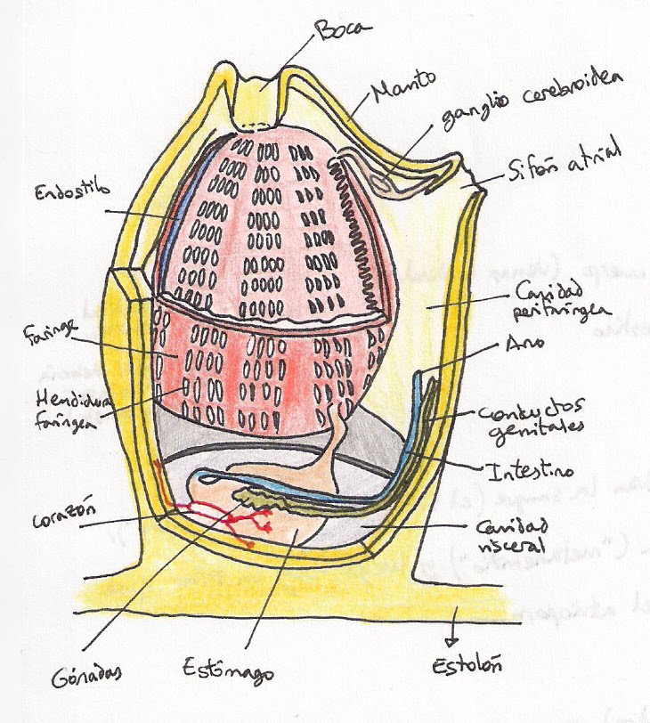 La faringe presenta muchas hendiduras, que no se abren al exterior sino a una cavidad perifaríngea. Poseen endostilo. Las ascidias coloniales pueden estar conectadas por estolones. Poseen una túnica general, así como dos testículos y un ovario. A menudo son proterádricas (la madurez de las gónadas no es simultánea, se desarrollan antes los testículos). Aunque sean hermafroditas, se da una fecundación cruzada.